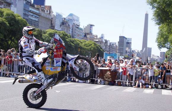 Los vehículos (140 autos, 67 camiones, 170 motos y 30 cuatriciclos) largaron desde las 14.30 desde el Obelisco y antes de las 17 los primeros cuatriciclos habían llegado al complejo termal Victoria del Agua, convertido en vivac de la competencia. Así, los pilotos, 74 de ellos argentinos, fueron cumpliendo con los primeros 377 kilómetros de una competencia que se extenderá por 16 días para llegar a más de 9 mil kilómetros.