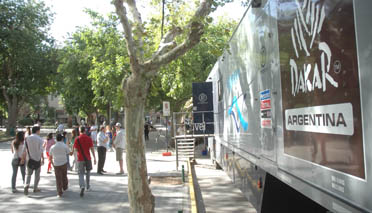 San Juan, 7 de enero.- En la plaza 25 de Mayo un camión del Instituto Nacional de Turismo, promociona el paso del Rally Dakar 2010 por San Juan. Los visitantes podrán ver videos y conocer detalles de la prueba.