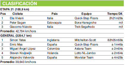 El ciclista italiano Elia Viviani (Quick-Step Floors) ganó ayer la 21 y última etapa de la Vuelta a España, disputada sobre 100,9 kilómetros entre Alcorcón y Madrid, tras imponerse en el embalaje masivo de una meta que sirvió de colofón al paseo de gloria del británico Simon Yates (Mitchelton-Scott) como vencedor de la general.