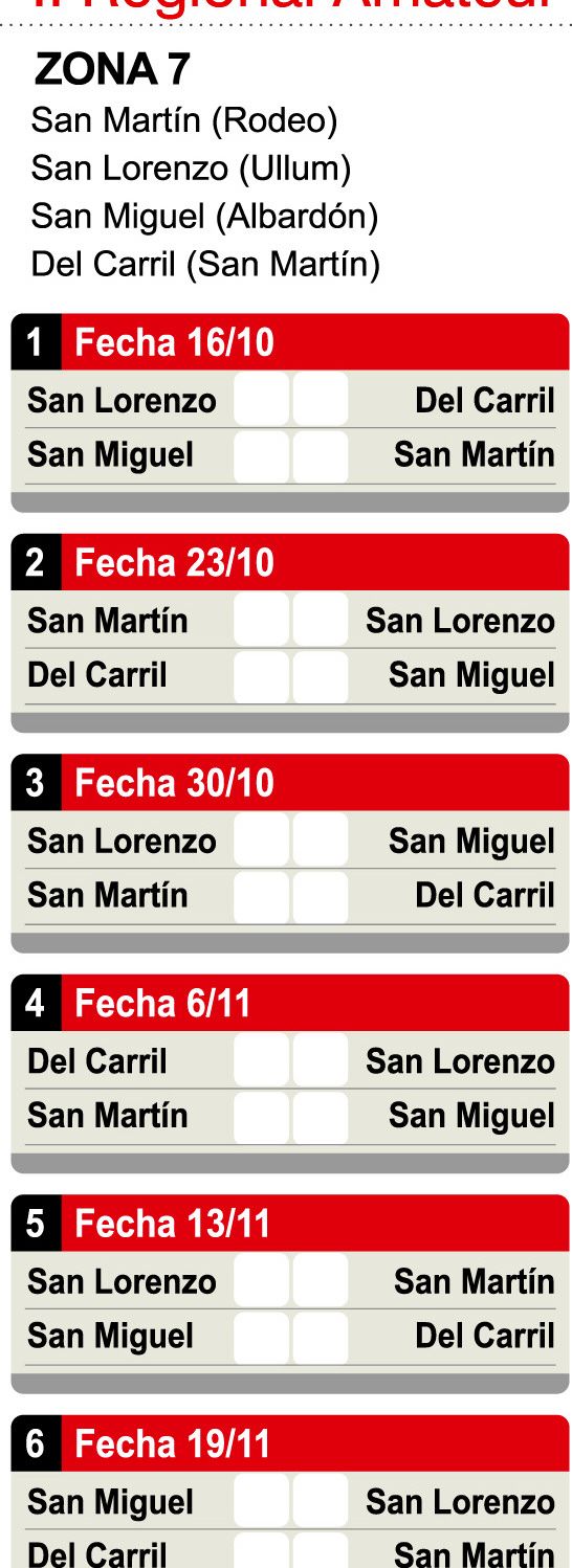 Para anotar: campeón iglesiano, campeón albardonero, campeón caucetero y puntero de la liga Sanjuanina. Un más que competitivo para darle forma a la Zona 7 de la Región Cuyo del Regional Amateur, sabiendo que la lucha por la clasificación será tremenda. Sportivo San Martín de Rodeo, Atlético San Miguel de Albardón, Sportivo Del Carril de San Martín y San Lorenzo de Ullum conforman este grupo que tiene planteles, nombres y aspiraciones de sobra para ser catalogado el Grupo de la Muerte en el apartado de los equipos de San Juan en el certamen que comenzará este fin de semana.