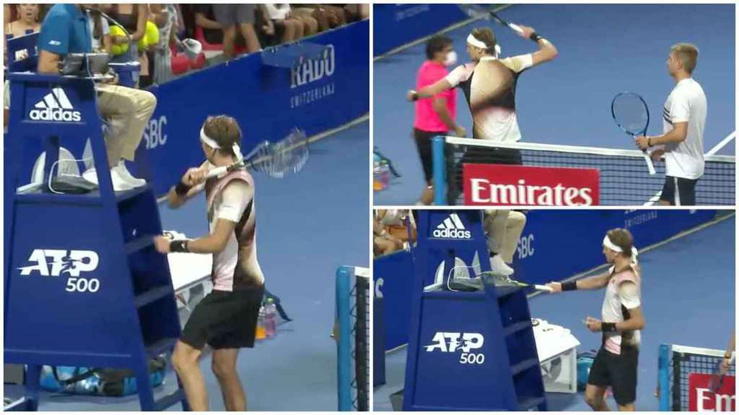 Molesto por las decisiones del juez, al final del partido Zverev se acercó a él y con la raqueta golpeó en repetidas ocasiones la base de la silla, según se puede ver en un video que circula en redes sociales.