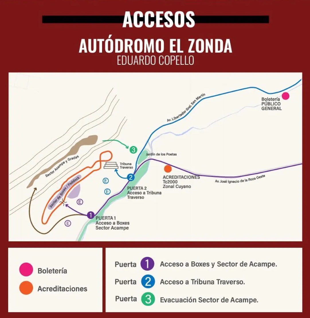 En cuanto a los accesos, por la Puerta 1 (la última puerta yendo desde Capital a Zonda) será el ingreso a boxes y paddock, como así también por allí ingresarán para el sector de acampe. En tanto que por la Puerta 2 (ubicada frente a la garita de Policía, en el Jardín de los Poetas), por allí ingresarán quienes asistan a la Tribuna Traverso.