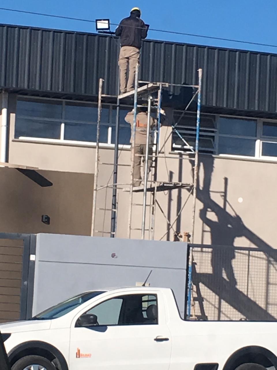Un lector envió una imagen y el siguiente comentario: "Así trabajan los obreros en altura en la construcción del establecimiento educativo de Avenida España, entre Agustin Gomez y Sarassa. Se puede observar que los operarios no cumplen con las medidas mínimas de seguridad: no tienen arnés, el andamio a simple vista no está atado a ninguna estructura fija y el operario que está más arriba sólo cuenta con un tablón como superficie de trabajo".