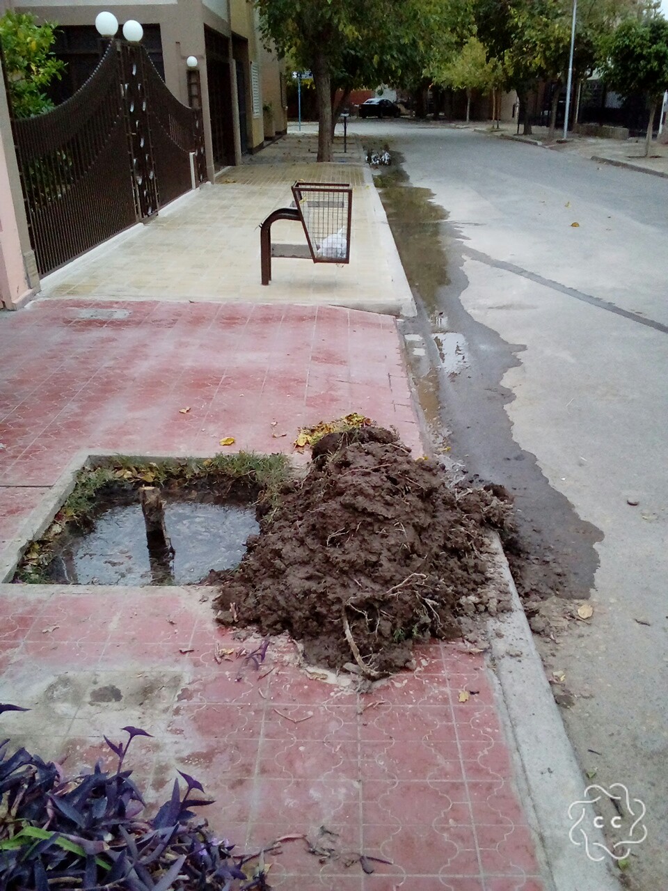 Esta es una foto del frente de mi casa. Un caño maestro de OSSE se ha roto y aflora el agua por la taza del árbol que se secó debido al agua. Se hacen reclamos de todos los vecinos de la cuadra a diario y no hay respuestas.