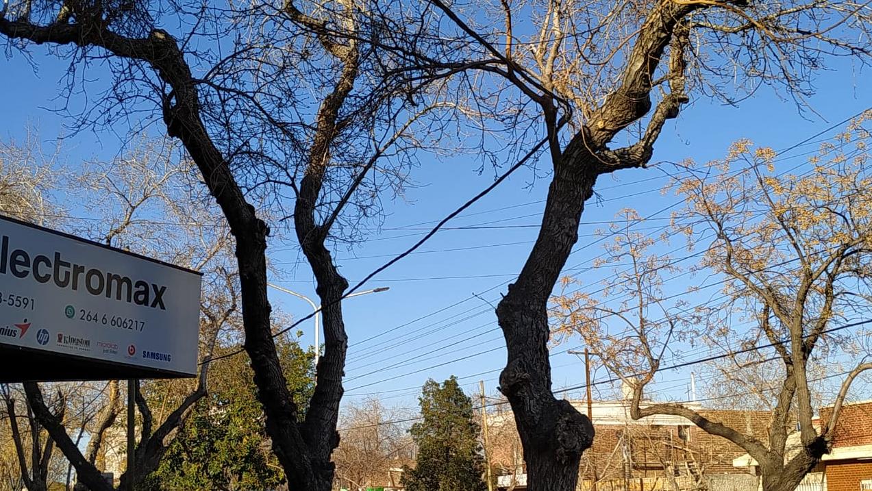 El hombre denunció el peligro que implica la situación que se da en la esquina céntrica de Avenida Rioja y San Luis. “¿El árbol funciona como un poste eléctrico?”, se preguntó.