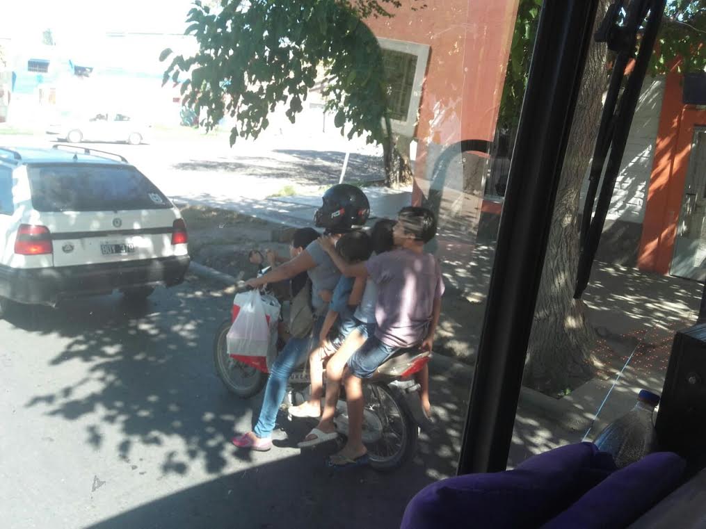La imagen fue captada esta mañana en el cruce de Líbano y Urquiza, en Rawson. Una mujer se trasladaba en moto con cuatro niños. Además, como si fuera poco, sólo ella llevaba casco.