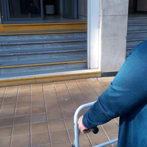 Una lectora envió una imagen en la que se ve parte del andador de su madre frente a las escaleras del edificio donde funciona la empresa Ecogas.