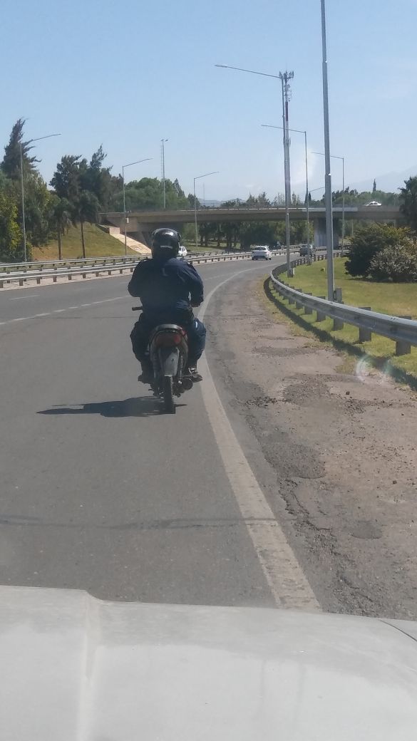 “Hola, quería compartir con ustedes el ejemplo que da la Policía de San Juan. En moto sin patente, sin casco y sin luces en la avenida de Circunvalación”.