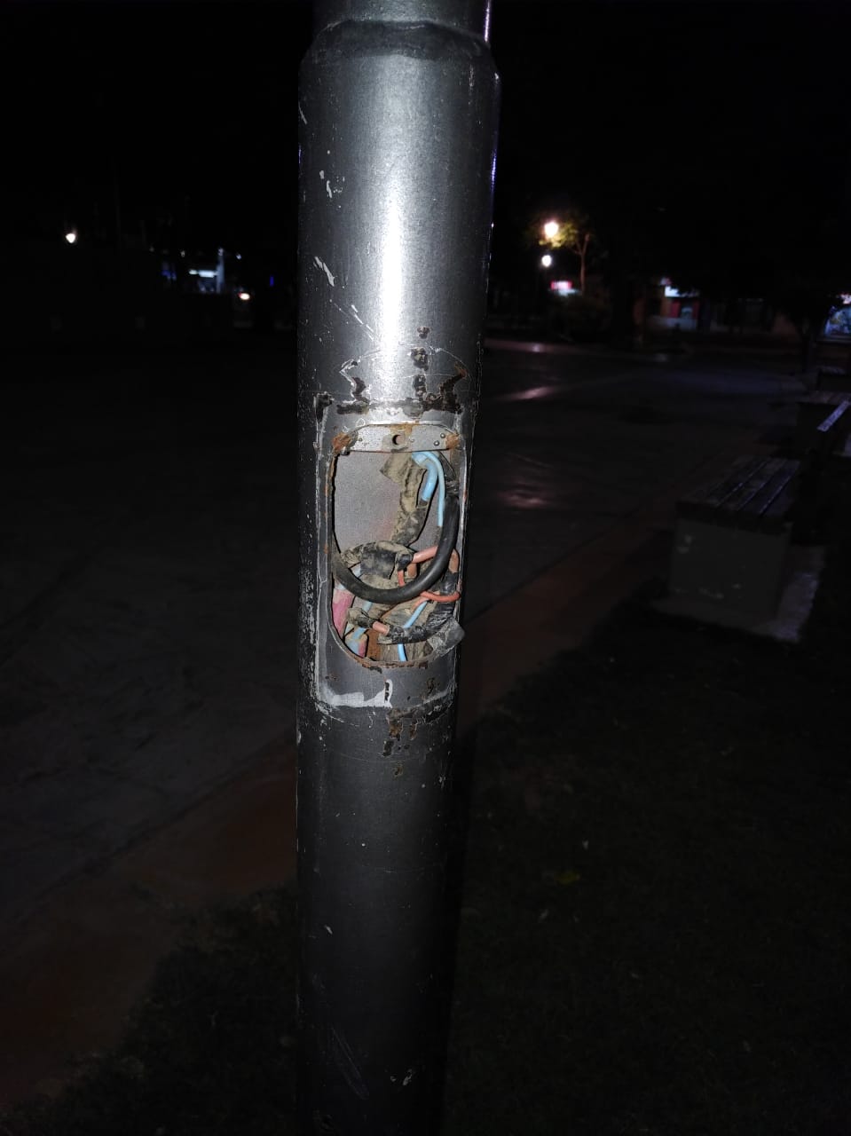 Un lector envió imágenes de farolas instaladas en la Plaza Hipólito Irigoyen, de Capital, con los cables al aire libre.