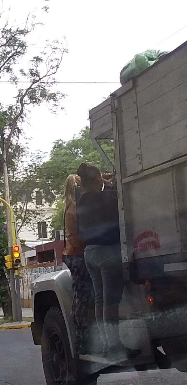 Un lector de DIARIO DE CUYO envió una imagen en la que se aprecia a dos mujeres tomadas de uno de los estribos de un camión recolector de basura, mientras éste estaba en movimiento. La fotografía fue tomada en pleno centro de la Capital, cerca del Hospital Rawson. Ambas mujeres están expuestas a cualquier tipo de peligro víal. Una imprudencia.