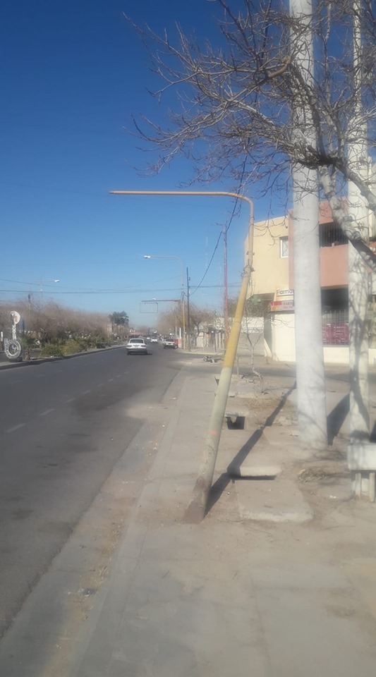 Un lector envió una imagen y el siguiente comentario: "Esta luminaria está en Avenida España casi Arenales, en Capital. Está doblada, vencida y no queremos que se caiga encima de nadie. Que alguien tome cartas en el asunto".