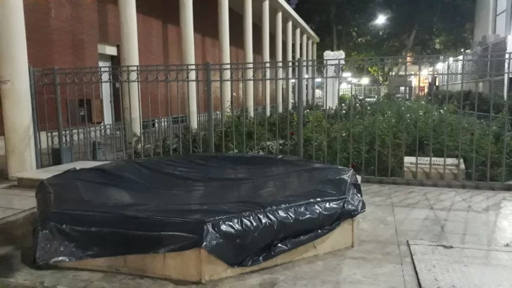 Un lector envió una imagen y el siguiente comentario: "No sé de quien fue la idea, pero me parece muy acertada. Protegieron con un nylon la fuente que está detrás de la Catedral y cuando me preguntar me dijeron que era para evitar el dengue".