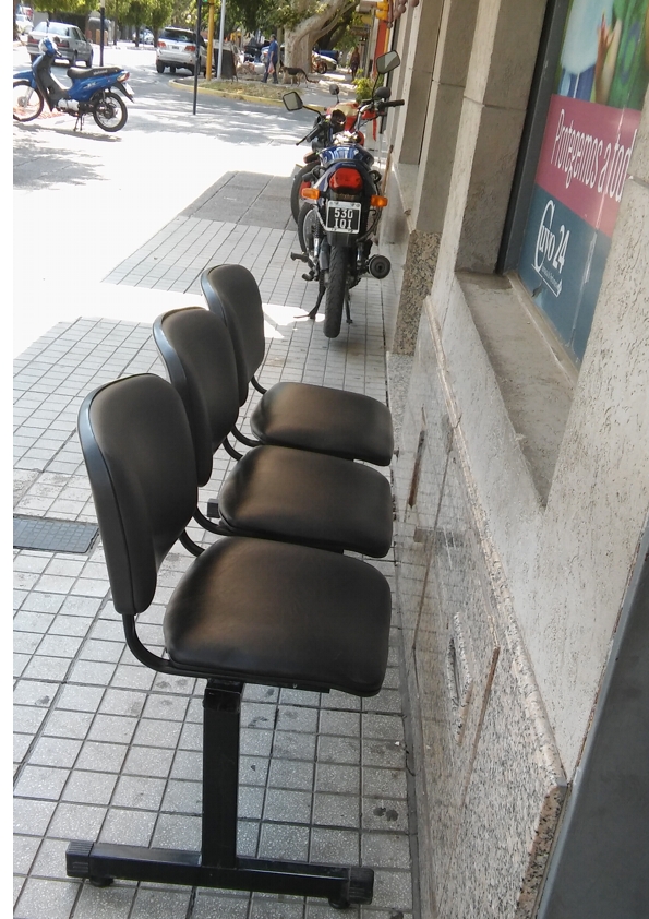 Un lector envió una imagen y el siguiente comentario: “Quien pasa por esta farmacia tiene que esquivar las sillas, las motos ¿algo más? Total que importa el peatón”.