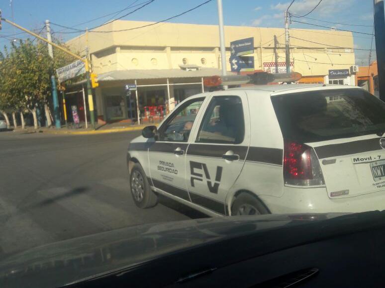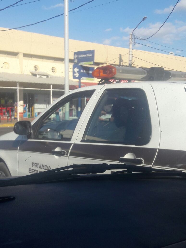 Una vez más un móvil de seguridad privada que comete una infracción. El conductor está hablando por celular mientras está tapando la senda peatonal. Esto fue en Calle 11 y Aberastain, Pocito.
