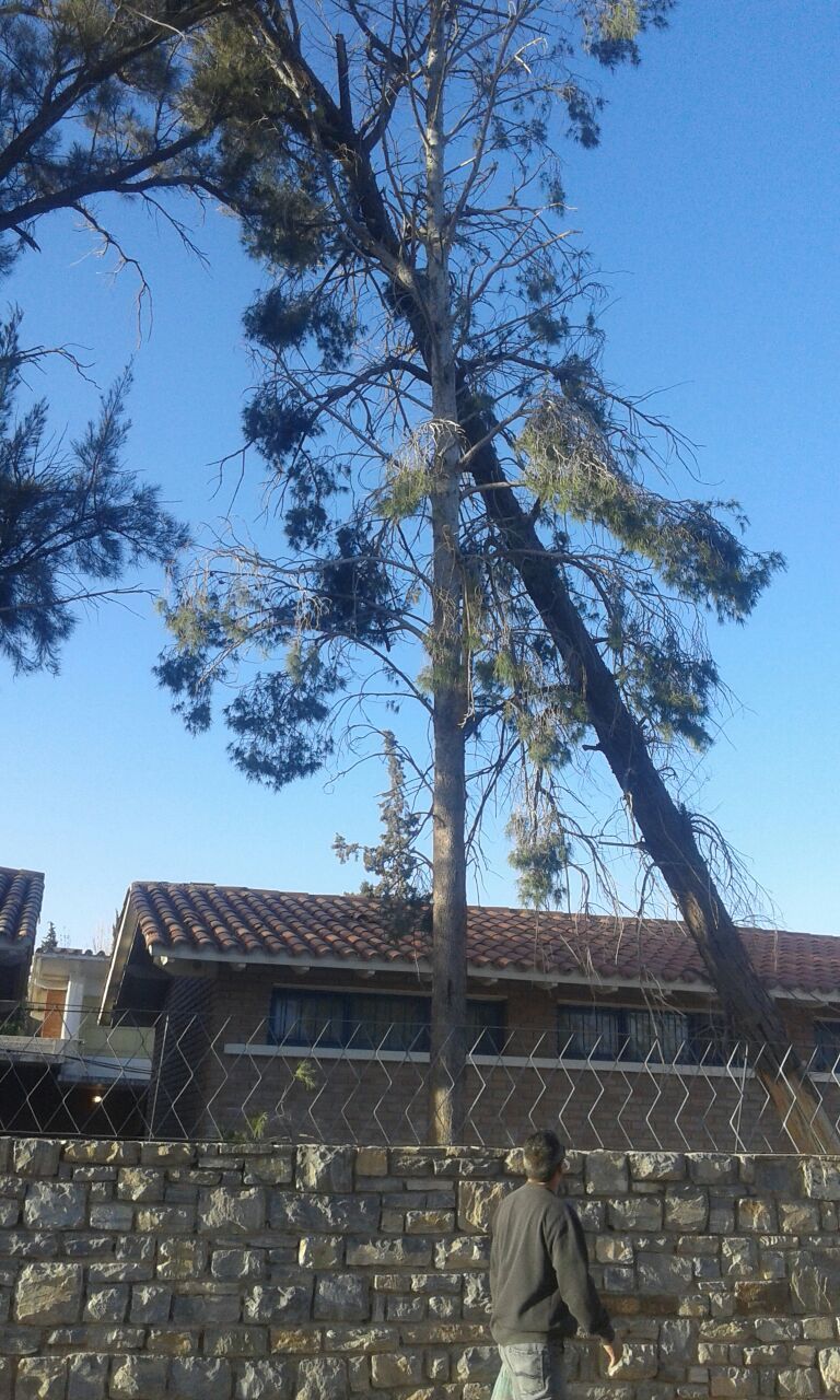 Está ubicado en el interior de la Escuela Cornelio Saavedra, en el Barrio Huazihul, al lado del jardín de infantes. Lo sostiene otro árbol. Desde el municipio fueron a ver el qué sucedía y pusieron cintas para evitar que los chicos pasen, pero el árbol continúa ahí. Los padres mostraron gran preocupación.