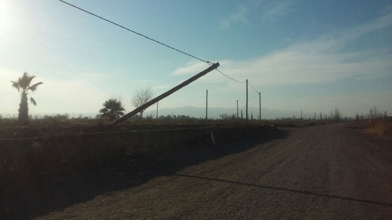 Un lector advirtió sobre un poste de electricidad colgando en el departamento de Santa Lucia y comentó: "Poste de tendido eléctrico caído hace un mes en el loteo de la Asociación Civil Crecer Santaluceno, luego de un fuerte viento sur".