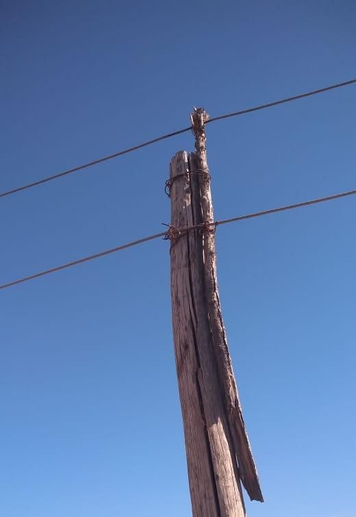Postes al borde de precipitarse y cables cada vez más destrozados en la localidad de La Bebida (Rivadavia). Así lo muestran las fotografías de un lector de DIARIO DE CUYO. Además, todos los días pasan los camiones de basura del municipio y, como los cables están a baja altura, los cortan. Según el lector, desde la Municipalidad solamente parcharon los cables cuando se cortaban pero que la problemática subsiste.