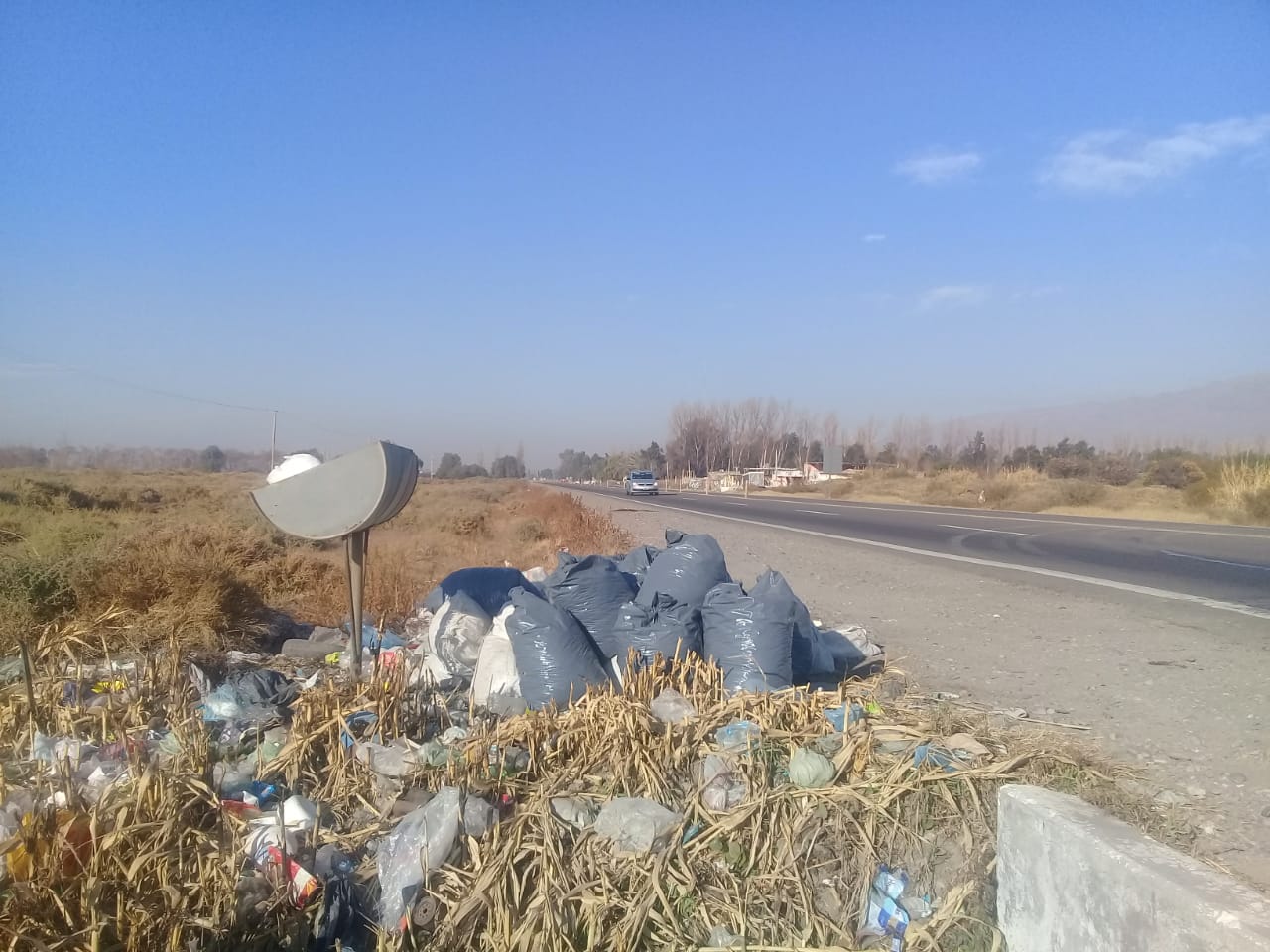 Un lector envió una imagen tomada sobre Ruta 40 a la altura de Calle 13, en Pocito, en la que se ve una montaña de bolsas de residuos.