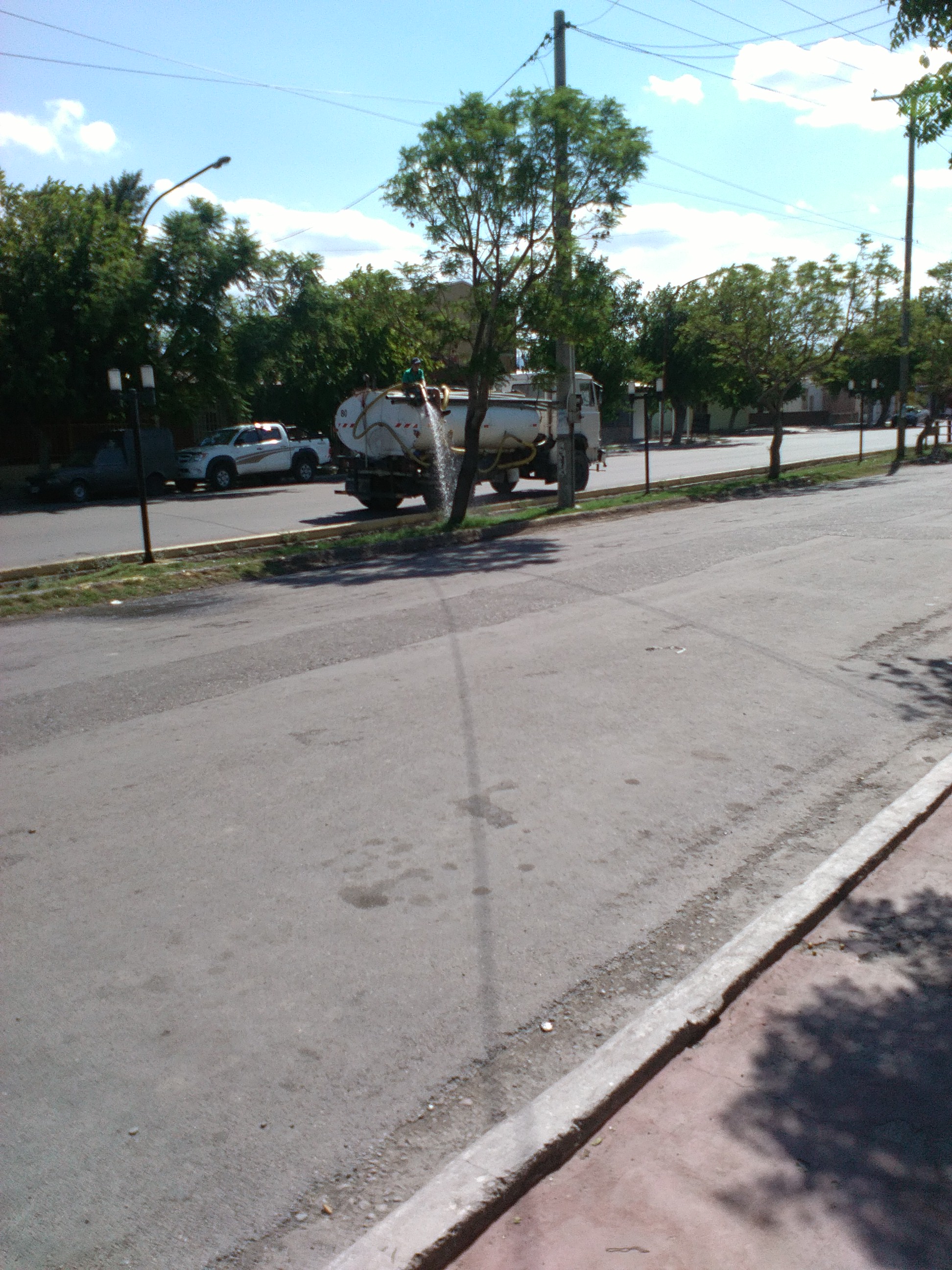 Un lector envió una imagen y el siguiente comentario: “Esta tarea de regar los boulevar debería ser con riego por aspersión, e sun peligro un camión ahí”.