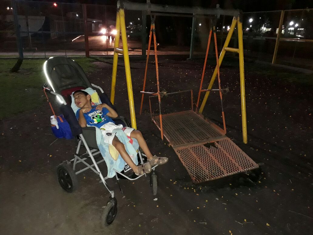 Un lector envió una foto y el siguiente comentario: “Hola buenas noches mi hijo Santiago se quedó sin subir al columpio que está destrozado en el Parque de Mayo. La gente los rompe y el Gobierno no lo arregla”.