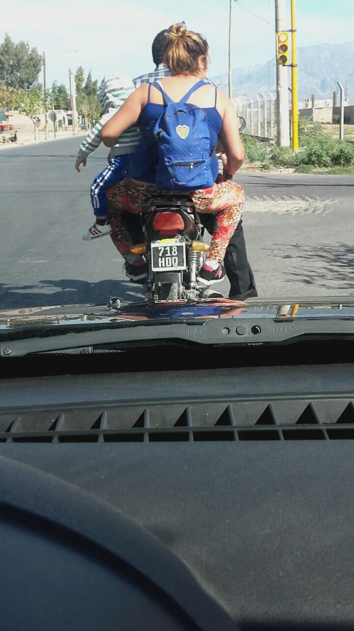 "Esto pasó en calle Vidart y Sarmiento, en Rawson. Van los tres en una moto, sin cascos y el pequeño al costado sin alguna protección".