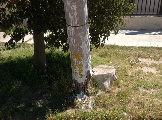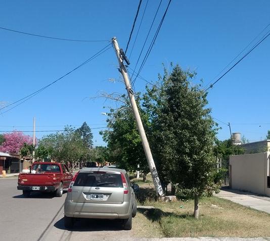 Un lector envió imágenes de un poste de luz que está peligrosamente inclinado hacia la calle frente a una escuela.