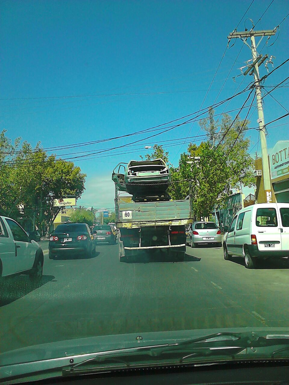 Un camión transportaba un auto que parece que venía de una chacarita pero no está atado y peligra la seguridad de otros vehículos o peatones. Eso fue en Mendoza antes de Comandante Cabot, en Trinidad.