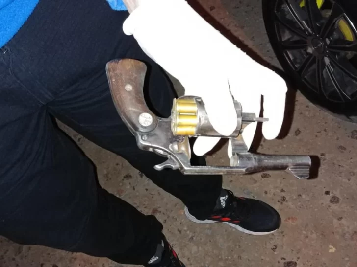 En el piso de la parte trasera del vehículo los policías encontraron un arma de fuego tipo revolver, cargado, con seis proyectiles en el tambor y una barreta de unos 60cm aprox. También, una mochila en cuyo interior había tres pasamontañas, un gorro de lana, varios pares guantes de latex, un par de guantes de tela y precintos.