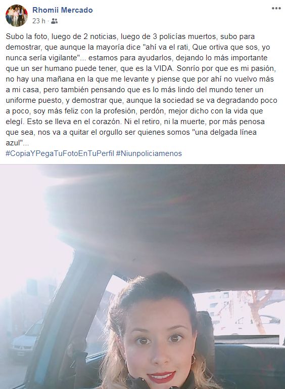 El texto que pengan en los muros es el siguiente "Subo la foto, luego de 2 noticias, luego de 3 policías muertos, subo para demostrar, que aunque la mayoría dice "ahí va el rati, Que ortiva que sos, yo nunca sería vigilante"… estamos para ayudarlos, dejando lo más importante que un ser humano puede tener, que es la VIDA. Sonrío por que es mi pasión, no hay una mañana en la que me levante y piense que por ahí no vuelvo más a mi casa, pero también pensando que es lo más lindo del mundo tener un uniforme puesto, y demostrar que, aunque la sociedad se va degradando poco a poco, soy más feliz con la profesión, perdón, mejor dicho con la vida que elegí. Esto se lleva en el corazón. Ni el retiro, ni la muerte, por más penosa que sea, nos va a quitar el orgullo ser quienes somos "una delgada línea azul".