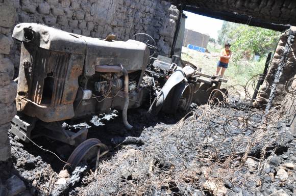 "Cuando salí a ver, todo estaba ardiendo. Quise hacer andar la bomba de agua para apagar el fuego, pero no se pudo", relató la mujer. Las llamas cubrieron por entero esa precaria construcción de adobe y caña, cuyas puertas de chapas tenían candado. Ahí no hay corriente eléctrica. Los bomberos no pudieron hacer mucho. El techo se desplomó y el tractor Jhon Deere quedó totalmente destruido con el arado a discos. "Es muy raro el incendio", dijo el peón Ramón Fernández, quien fue el último que utilizó el vehículo y lo guardó a las 14 del jueves. La hipótesis es que pudo ser un incendio intencional.
