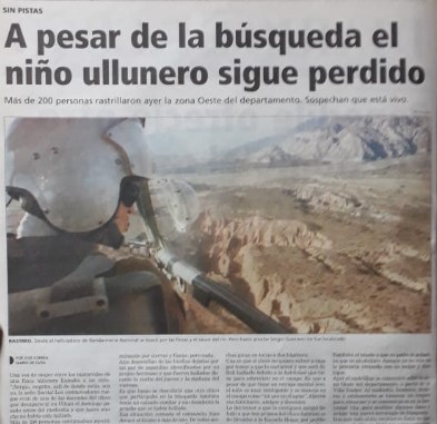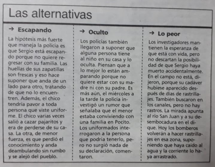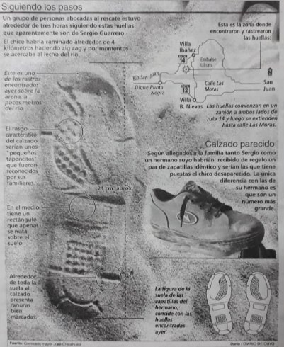 Policías, bomberos, gendarmes, perros, baqueanos, vecinos, familiares. Todos abocados a la aparición de Sergio. Durante días se realizaron rastrillajes de 18 kilómetros a la redonda, se buscó bajo el agua e incluso en pozos, temiendo que el pequeño pudiera haber caído. Pero nada. También se utilizó el helicóptero de Gendarmería para tratar de hallarlo desde el aire. Pero todos los intentos fueron en vano.