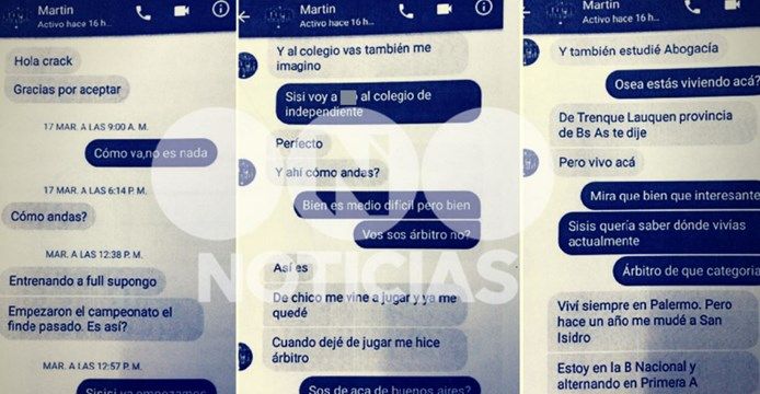 Esta conversacion es una de las tantas que están en el expediente que investiga la fiscal María Soledad Garibaldi y que le permitió detener al árbitro e imputarlo por abuso sexual y promoción de la prostitución de menores de edad.