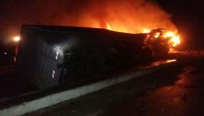 Mendoza.- Ocurrió anoche en al ruta 143, a unos 4 kilómetros al sur de Paso de las Carretas, en Pareditas, departamento de San Carlos. En un desvío de un puente averiado que hay allí, un camión semiremolque Volvo de la empresa Andesmar cargas, que transportaba elementos a Caleta Olivia, Santa Cruz, en el que iban un hombre de 45 años y su hijo de 21 (ambos de Guaymallén), volcó tras chocar contra un montículo de tierra y luego se prendió fuego: ambos fallecieron calcinados, según informaron medios periodísticos del Valle de Uco.