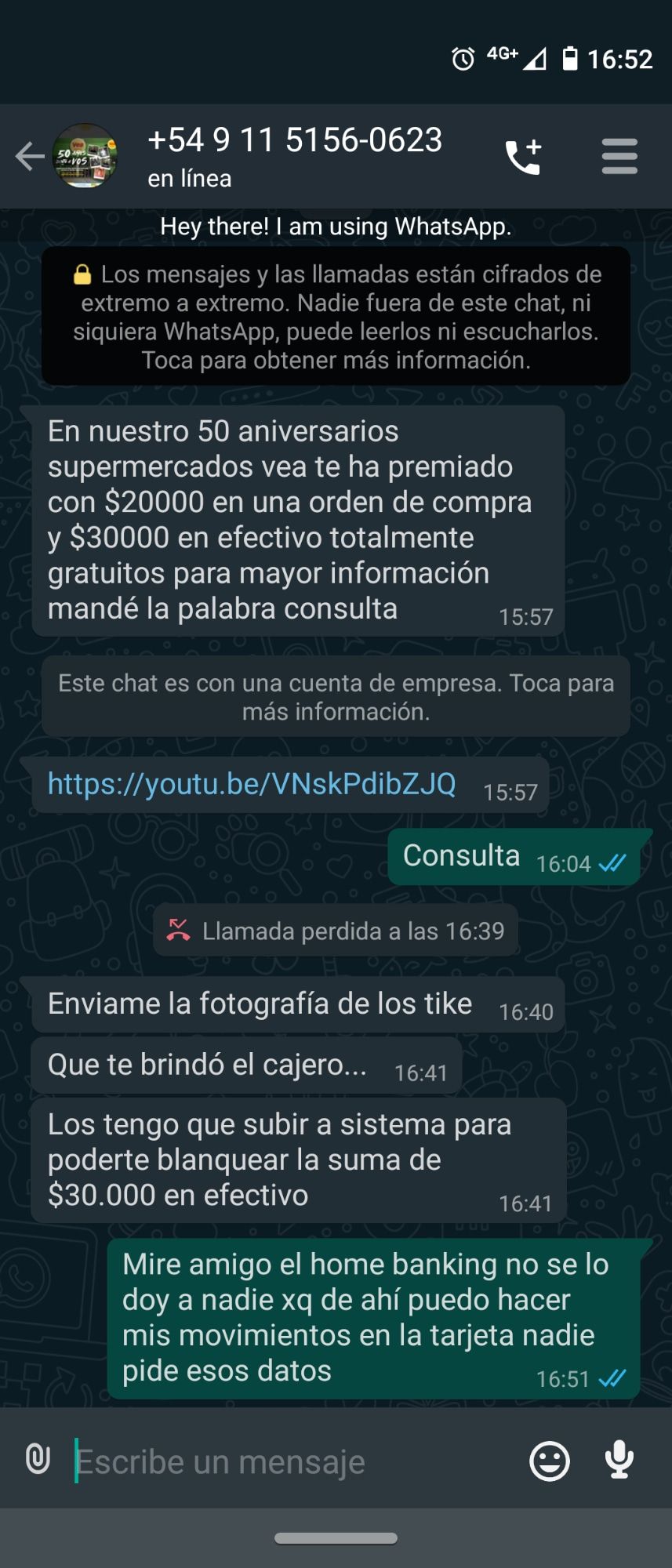 “A los cinco minutos de haber comprado me llega un mensaje por WhatsApp con un video promocional e indicándome que había ganado un premio de 30 mil pesos en efectivo y una orden de compra por otros 20 mil en el marco de los 50 años del supermercado”, indicó Domínguez.