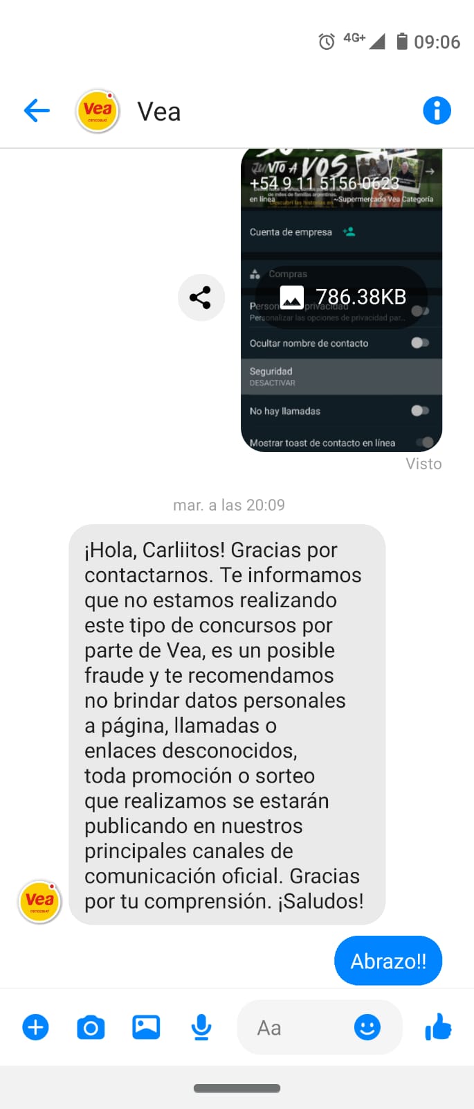 El hombre, que respondió a los mensajes del número con característica de Buenos Aires comenzó a recibir llamadas constantes y decidió comunicarse directamente con el supermercado. “Llamé al 0800 del VEA e inmediatamente me indicaron que no tenían ninguno de esos premios ni concursos en vigencia y que evidentemente se trataba de una posible estafa. También me recomendaron que evitara dar cualquier tipo de información personal”, comentó Carlos.