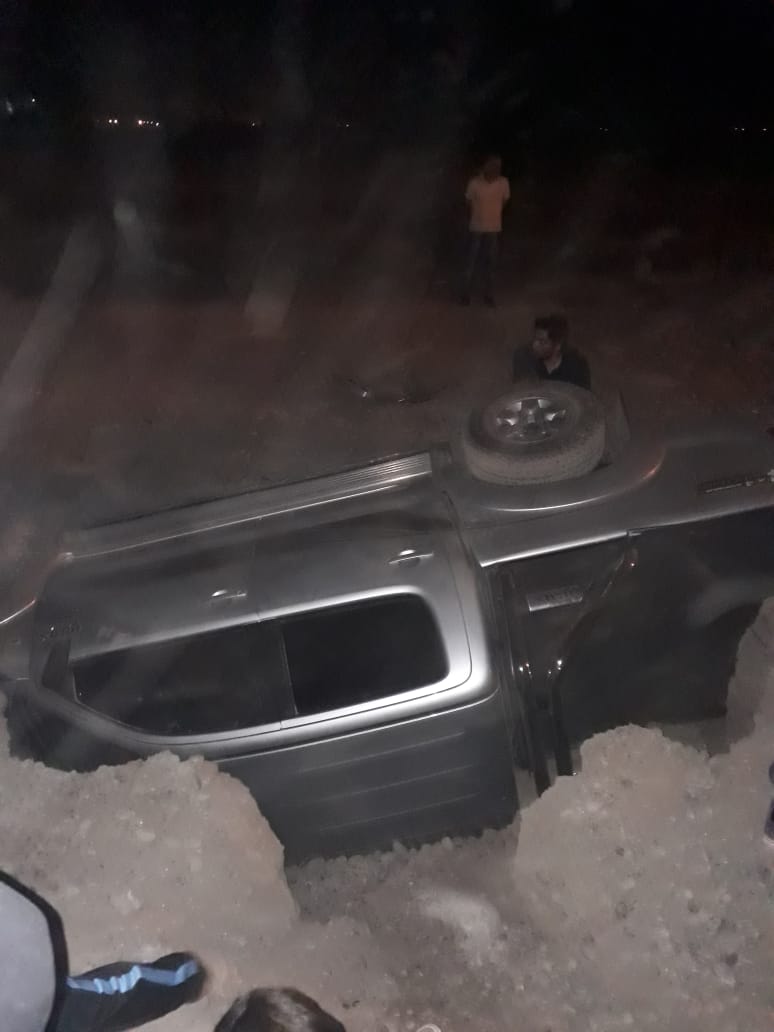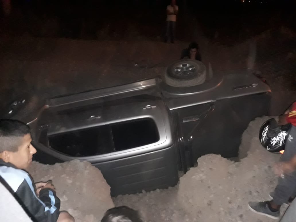 Esta noche, alrededor de las 22, una camioneta quedó adentro de una zanja profunda de las obras cloacales que se están realizando en Calle 6, entre Lemos y Frías, en Pocito.
