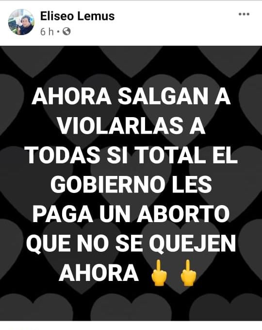 Por este motivo, organizaciones feministas locales como Ni Una Menos SJ y Mesa por el aborto legal en San Juan denunciaron a Eliseo Lemus por las desafortunadas palabras que escribió en su perfil de Facebook.