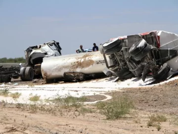 Eso sí, luego del vuelco los daños fueron considerables. El camión y las dos cisternas quedaron muy destrozados y la carga de cal líquida esparcida en la calle y la banquina. Por eso se hizo necesario el trabajo de una dotación de Bomberos para controlar el derrame del líquido.