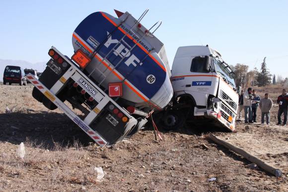 Un camión Volvo con 35.000 litros de gas oil minero de "YPF" que viajaba desde Mendoza a Gualcamayo, Jáchal, terminó envuelto en una peligrosa maniobra ayer a las 4.30 a un costado del km 3.416 de la ruta 40, en Colonia Fiscal, Sarmiento. El chofer, Luis Bustos (42), se habría quedado dormido y se fue contra un puente, arrancó un poste y quedó al borde de volcar. El conductor sufrió lesiones leves, informaron en la Policía.