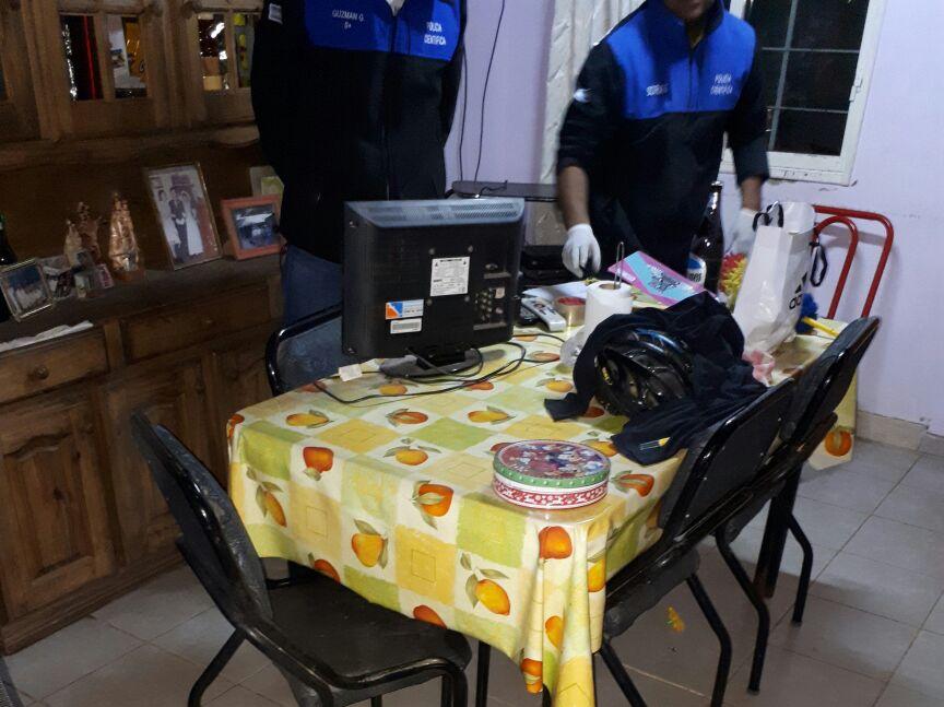 La Subcomisaría Santa Lucía Este intervino en el hecho y constataron que cerca de la puerta estaban colocados los elementos que se iban a llevar: una bicicleta todo terreno, un CPU, un monitor, un televisor, un porta bicicletas y una botella de cerveza.