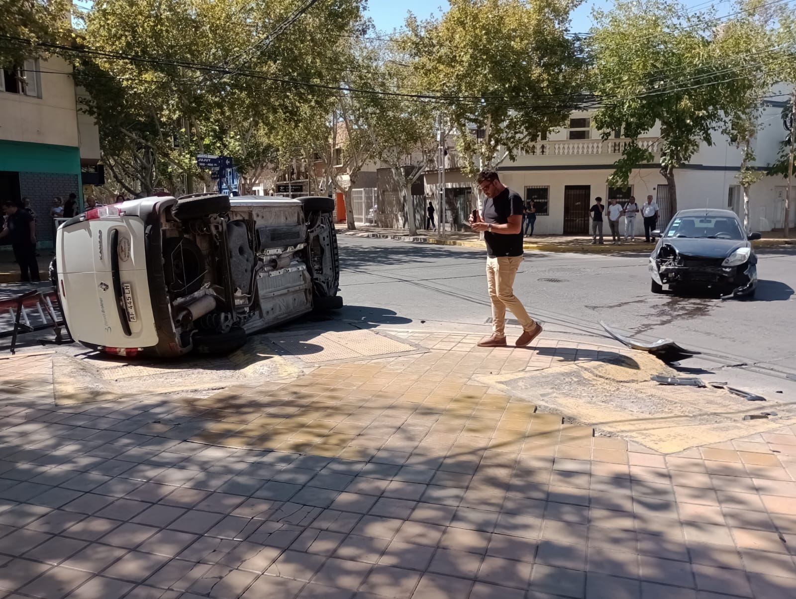 Pocos minutos antes de las 12 de este jueves, en la concurrida esquina de calles Santa Fe y Jujuy, en Capital, se produjo un aparatoso accidente que de milagro no tuvo heridos, en virtud que uno de los vehículos involucrados quedó sobre la vereda, en una hora de mucho tránsito.