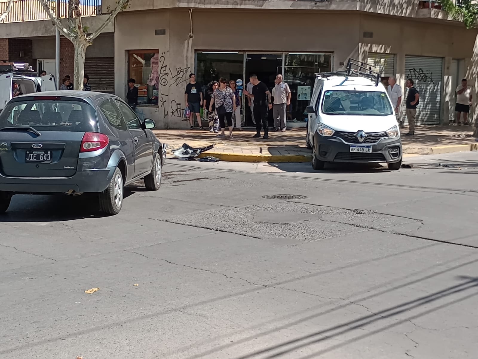 Un auto Ford Ka, que circulaba por Santa Fe e iba conducido por una mujer, impactó justo en el cruce de las arterias con una Renault Kangoo, donde iban dos hombres. Por la violencia, el utilitario terminó volcado en la vereda, donde por fortuna no circulaba nadie. El vehículo pertenece a una empresa de servicios, precisaron.