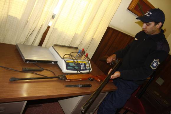 El dato de los policías de calle encabezados por el oficial Servant y el cabo Cárpena (seccional 2da., dirigida por el comisario Marinero) era que el sujeto sería autor de un asalto. Ayer llegaron a su casa de Necochea al 2055 Norte, Capital, y no lo hallaron, pero se toparon con una escopeta doble caño calibre 16, cinco cartuchos, un rifle de aire comprimido, una balanza electrónica, un DVD y cosas de dudosa procedencia.