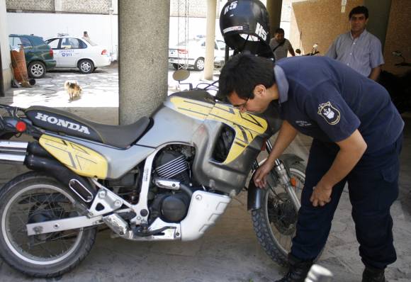 Policías del Comando Radioeléctrico (el oficial Néstor Montiveros y el agente Mario Moreno) recuperaron ayer una moto Honda Transalp 600cc, robada el domingo a Américo Gómez en Desamparados, Capital. Y usada por dos sujetos que rompieron un vidrio del auto de Rosa Vidable en Salta y Falucho, Capital, para robarle una cartera con $400, anteojos recetados y documentos. La moto fue incautada tras una persecución, con caída de los ladrones (huyeron a pie) en el Lote Hogar 8, Chimbas, informó la Policía.