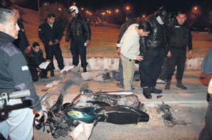Con los datos aportados por las víctimas, policías del Comando Radioeléctrico dirigidos por el comisario Ricardo Guzmán encontraron a seis sospechosos en tres motos en inmediaciones de San Lorenzo y Circunvalación, donde se inició una persecución, con disparos incluidos, que finalmente derivó en el Lateral Oeste de Circunvalación, con un móvil al mando del oficial Nelson Otarola pisándole los pies y otros más detrás. Según la policía, un par de esos sospechosos resbaló cuando intentaron girar por Libertador al Este y no tuvieron escapatoria. Anoche, eran investigados en la Central de Policía.