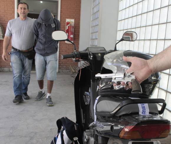 Un joven de 23 años en moto fue apresado in fraganti el viernes a las 22 por efectivos de la seccional 5ta cuando asaltaba a mano armada con un cómplice (prófugo) un kiosco de Hipólito Yrigoyen 2.286 Este, en Santa Lucía, a una cuadra de la comisaría.