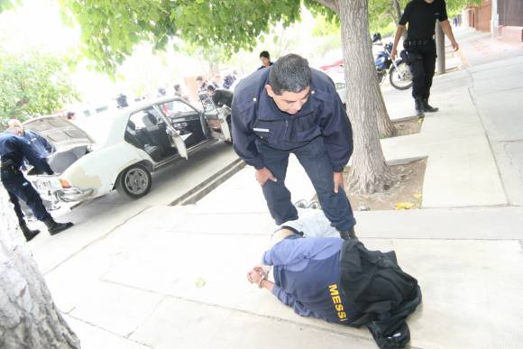 Según la policía, el marido de la víctima alcanzó a ver cuando los ladrones escapaban en un auto blanco. Fue así que salió en otro coche a perseguirlos en dirección al barrio Aramburu, Rivadavia, mientras otras personas llamaron a la policía. Varias patrullas del Comando Radioeléctrico y de la Seccional 27ma. salieron a buscar a ese auto blanco hasta que lo interceptaron en calle Cipolletti, entre Alberdi y Virgen de Lourdes. Ahí detuvieron a Julio Sosa (64), quien iba solo en ese Peugeot 504, indicaron las fuentes. En el interior del vehículo secuestraron tres barretas y cuatro bolsas con un total de 790 pesos en monedas.