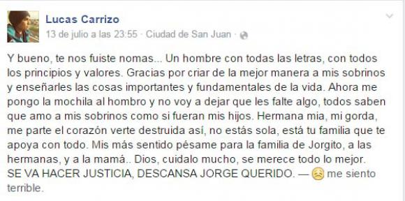 San Juan, 15 de julio.- El mismo lunes que Jorge Moreno murió de un disparo en su casa de Villa El Salvador, en Chimbas, su cuñado Lucas Carrizo le dedicaba unas sentidas palabras en Facebook. Un día después y en pleno velorio fue detenido por encubrimiento.
