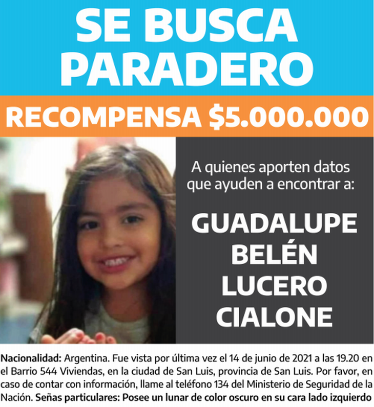 El Gobierno nacional, mediante la Resolución 434/2021 del Ministerio de Seguridad publicada este miércoles en el Boletín Oficial, aumentó la recompensa para intentar dar con el paradero de Guadalupe Lucero, desaparecida desde el 14 de junio pasado.