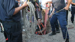 Numerosos vecinos y curiosos se hallan en el lugar presenciando el rastrillaje del infortunado operario mientras el Jefe de Bomberos, Rogelio Alcayaga lleva adelante el salvataje.